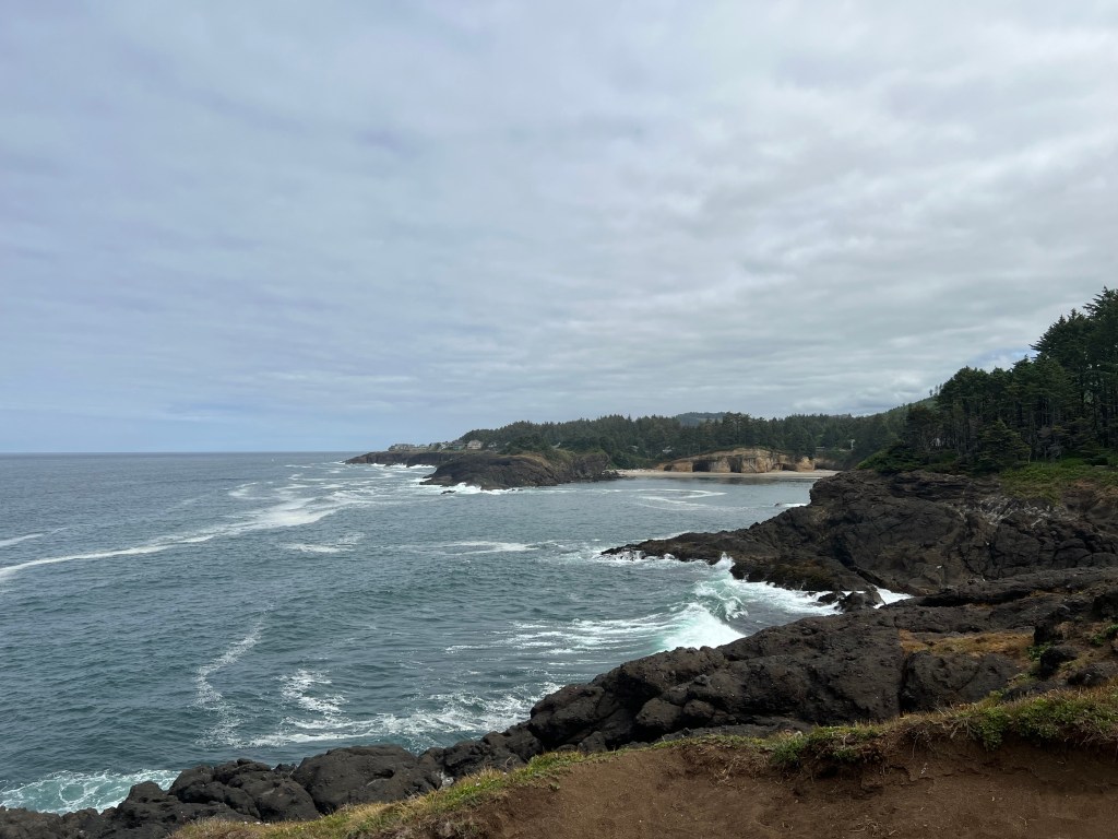 View from the cliffside of Cape Arago, Oregon. There is a good amount of fog on the right side of the image and over the water before the cape.